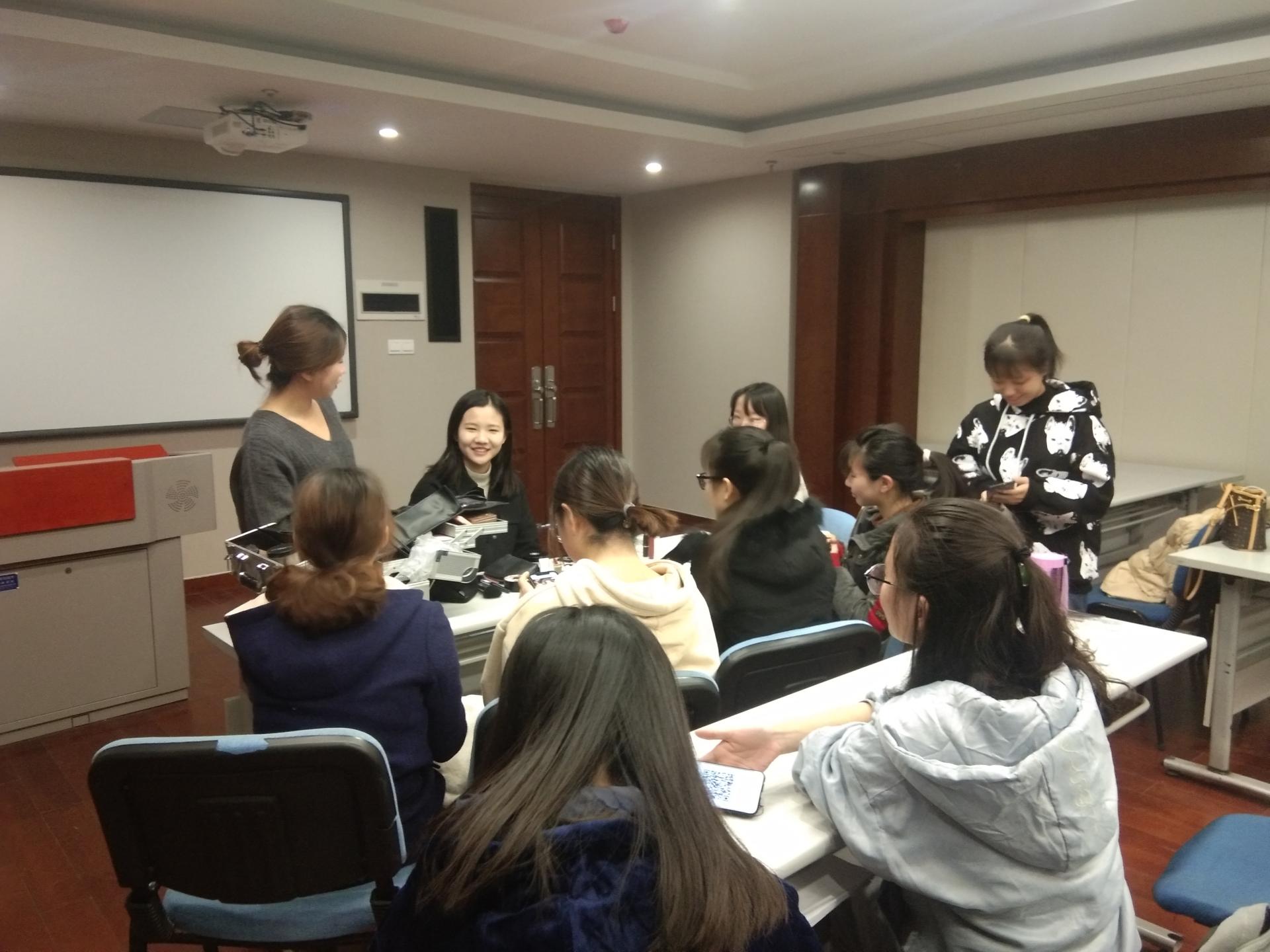 课程开始,邹丽老师向同学们详细介绍了护肤与化妆流程,并举例说明了职场女性拥有较好妆容的重要性。随后,老师邀请了一名同学作为模特示范上妆,其余同学观察。示范期间,老师详细向同学们介绍了各自护肤品和化妆品的具体用法,并根据同学们的自身情况进行了品牌推荐。