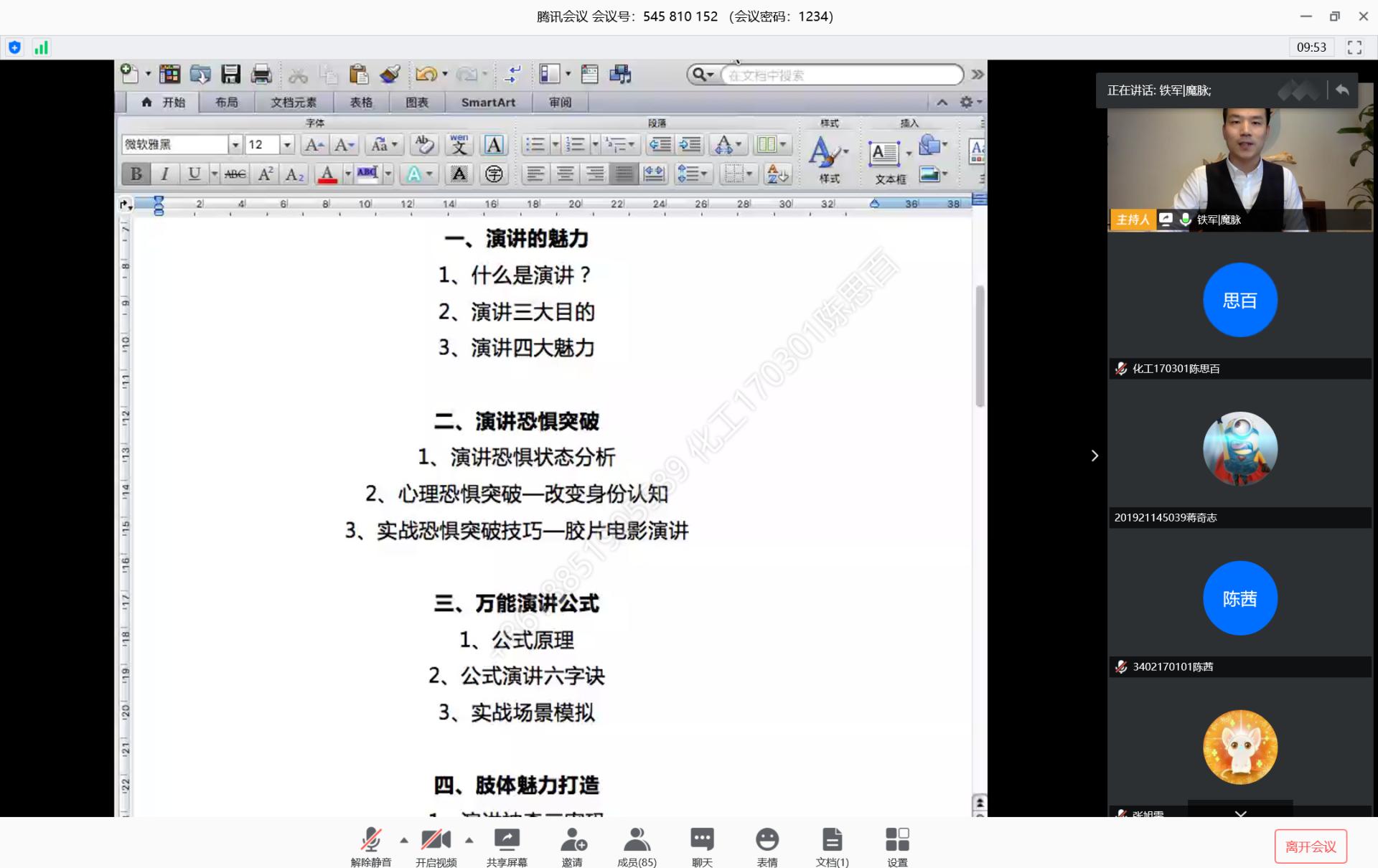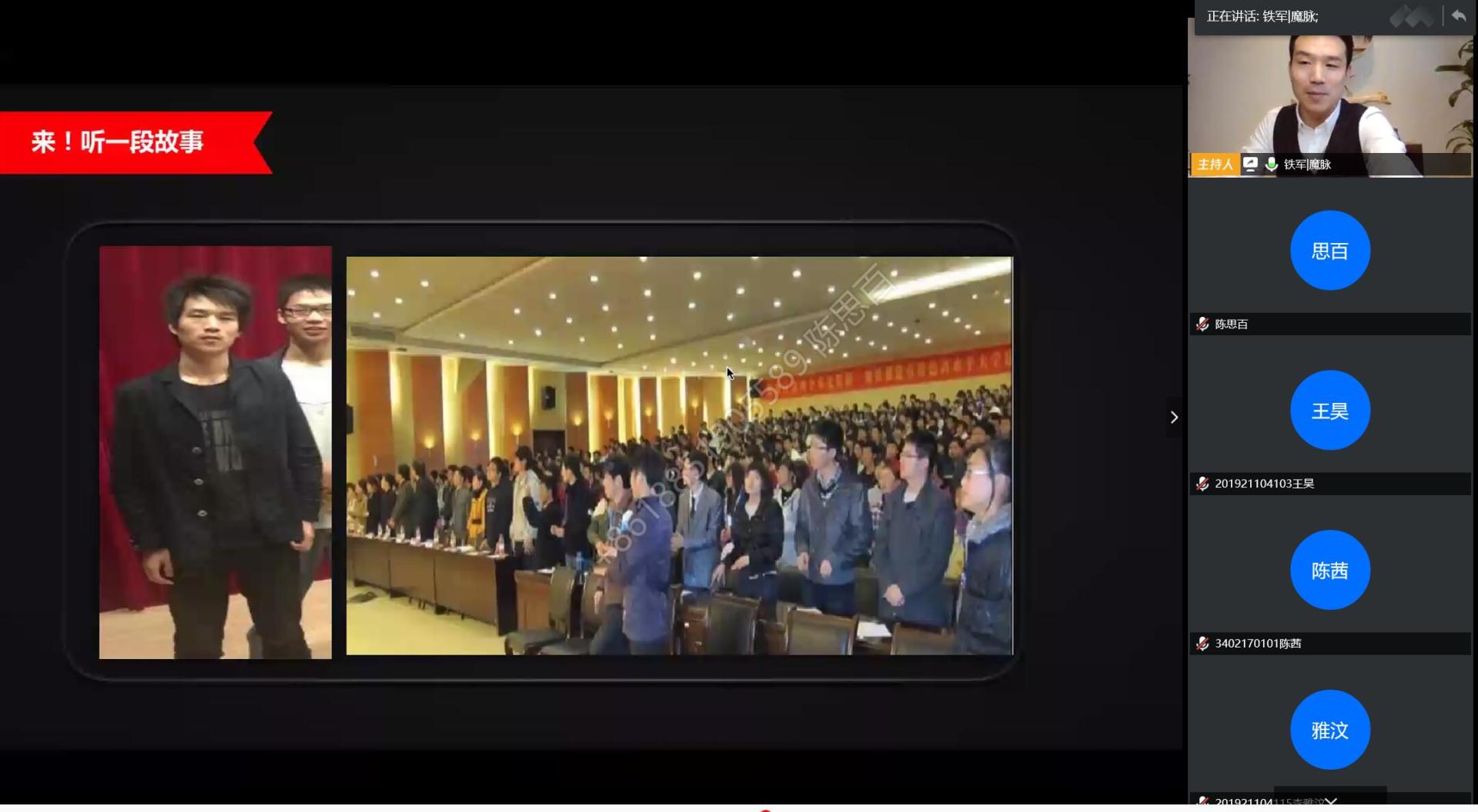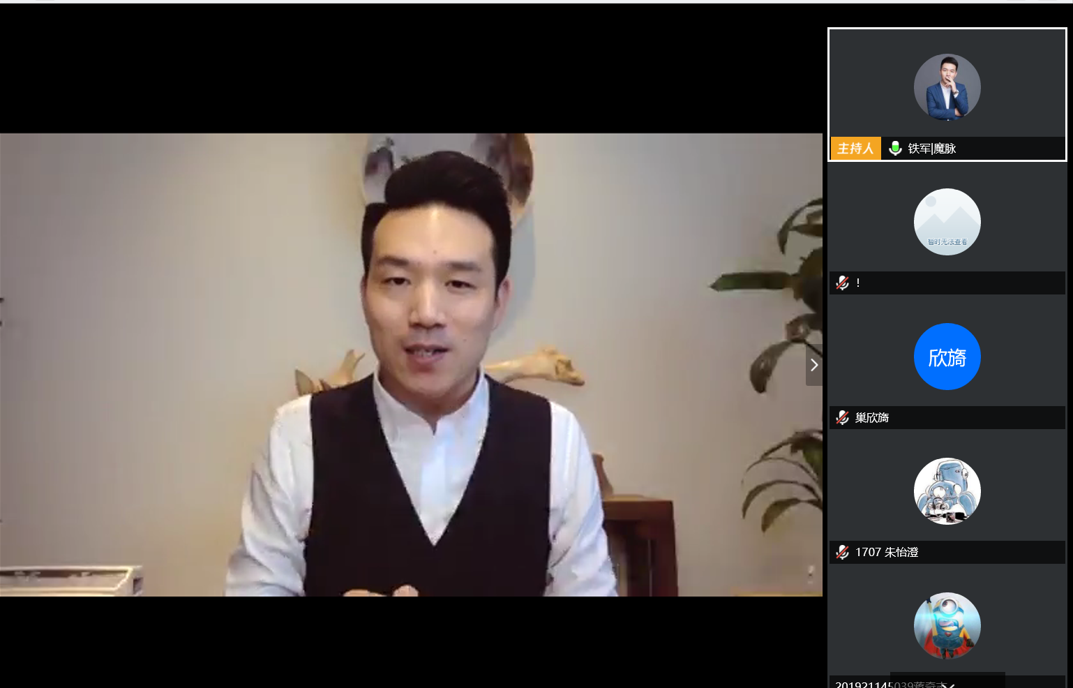 本次课程盛情邀请了魔脉演讲的创始人、首席演讲训练师-铁军老师进行授课。课程分为演讲的魅力、演讲的恐惧突破、万能演讲公式、肢体魅力打造、魅力发声训练、现场问答六个模块。铁军老师先用演讲的定义引出课程,总结了建立自信、激发潜能、人脉拓展、领袖风采的演讲四大魅力。然后指出演讲中的"四大恐惧",而克服恐惧是要在心理上将自己从“索取者”变为“分享者”,手法上用"一段一停留,一停一交流,一交一留情"的口诀让我们印象深刻。其次,铁军老师揭示了演讲的万能公式"言之有物、言之有序、言之有情",用“总分总”分段落引出 “好、高、名”的万能演讲公式,中间内容则采用三点论,“感、呼、祝”则是万能演讲公式的结尾。铁军老师现场利用公式进行即兴演讲,让我们深刻体会到了演讲的魅力。紧接着,铁军老师用幽默风趣的视频让我们体会到肢体语言在演讲中的重要性。要诀“锁骨牵引一根线,添两胯一抱拳”,即使隔着屏幕同学们也练习起来。