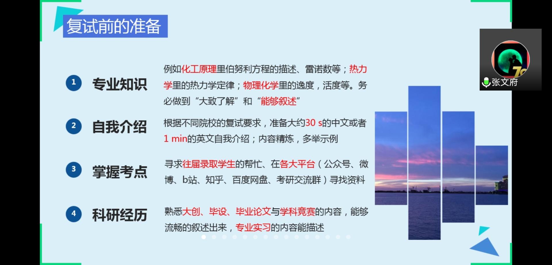 首先,张文府学长从复试前准备和面试临场发挥两个方面详细的讲解了如何准备复试,并提醒同学们,由于疫情情况,复试备战时间不断拉长,大家要好好利用这段时间多学一点,稳住就是王道。随后,郭亚杰学姐从天津大学的分数计算,复试流程,参考资料,导师情况四个方面详细的介绍了复试整个流程,她还强调了复试中笔试的重要性并传授了一些复试的小技巧。最后,汪辉林学长详细的介绍了华东理工整个复试的流程并告诉考研学生复试中常见的提问和回答。一个多小时的交流会内容丰富,会后同学们纷纷表示干货十足,考研复试备考更有信心了。