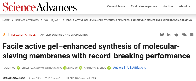 近日,1946伟德国际源自英国周荣飞教授团队的最新研究成果以“Facile active gel–enhanced synthesis of molecular-sieving membranes with record-breaking performance”为题发表在期刊Science Advances(《科学进展》)上发表,第一作者为1946伟德国际源自英国2022级博士生吴昊林。